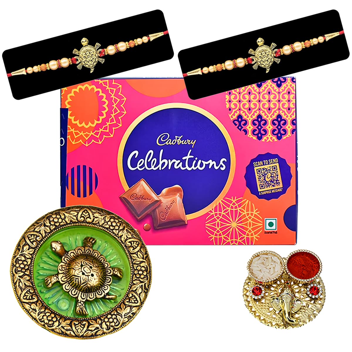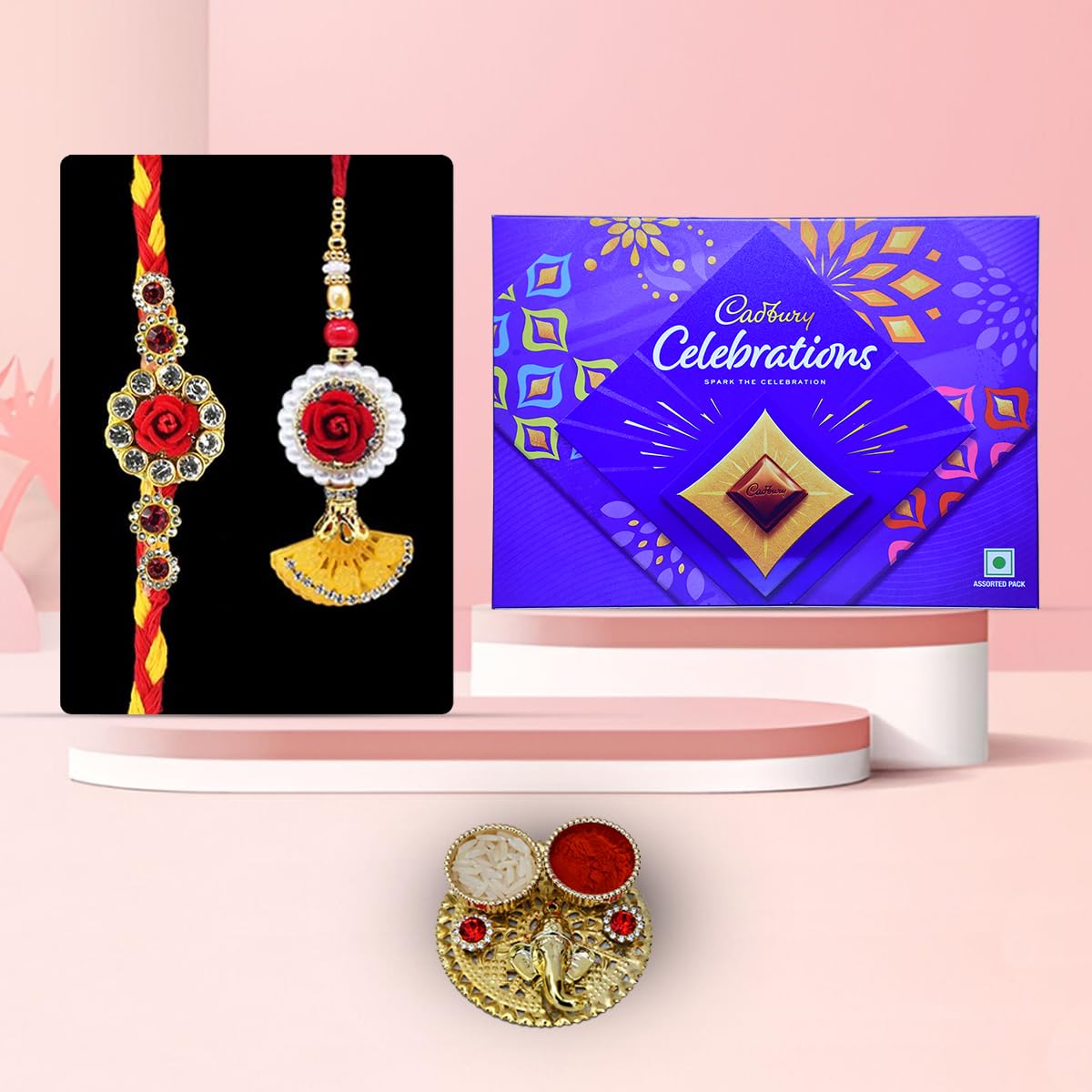 - Sale Package: Pack of 2 Radha Krishna Rakhi for Brother and Bhabhi, 1 Raksha Bhandan Greeting Card, 1 Ganesha showpiece, 1 Chocolate Pack, 1 Roli Chawal and Chopra Pack