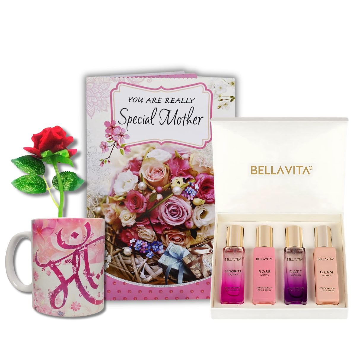 - Package Contents: 1 Greeting Card, 1 Women Perfume Gift Set Pack of 4x20ml, 1 Personalised Printed Maa Coffee Mug, 1 Artificial Red Rose Flower.