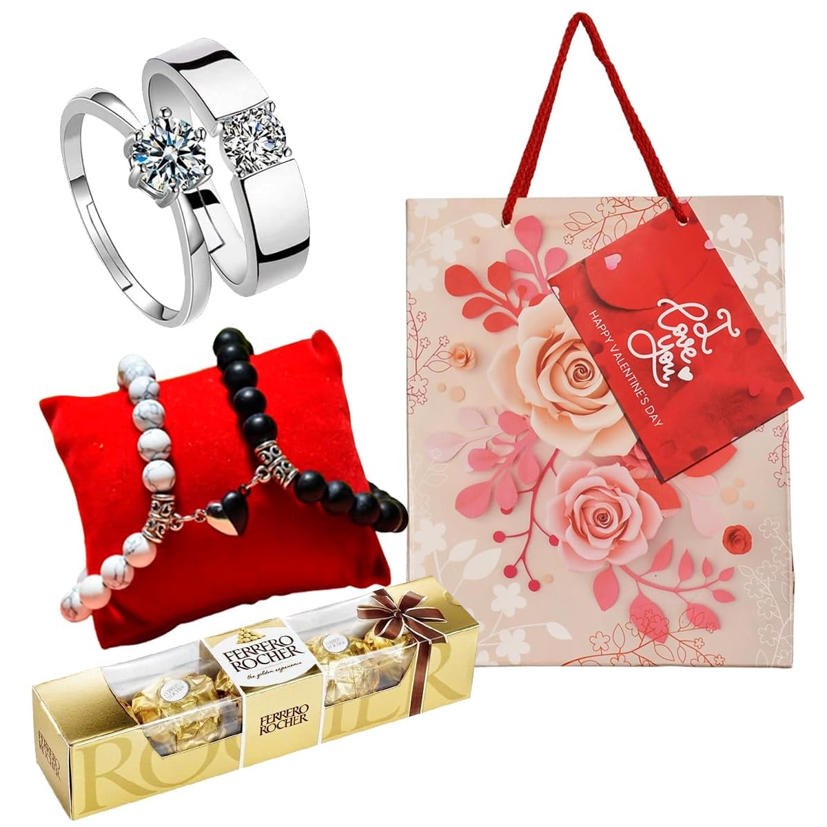 - Sale Package: Couple Rings Set and 2 Couples Magnetic Bracelet, Chocolate Box (Pack of 4 Pieces, 50 g), 1 Paper Carry Bag (Random Design).