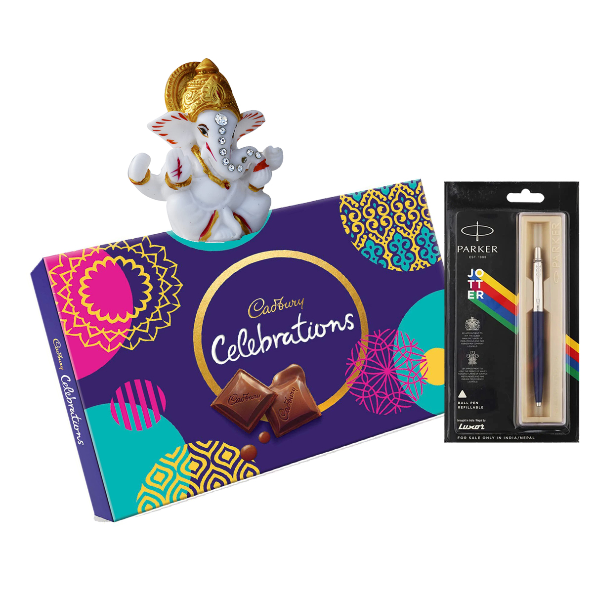 | Description | Saugat Traders presents a wonderful parker ball pen, Lord Ganesha showpiece and chocolate celebration (pack of 178 gm). These gifts are fun, exciting, engaging, and timeless for them to cherish your care and affection forever. Gifts are always the symbol of love, passion, friendship, or purity - meant to express emotions and feelings. Special gift for New Year and festivals. We always use high-quality materials and the perfect combination of gifts to make everyone happy. The items are made of high-quality material which makes them safe and non-toxic. Gifts for clients, customers, doctors, advocates, corporate clients, father, brother, husband, boyfriend, colleagues, office staff, employees, and family & friends. A great gift combo by buys on this warm new year. All products are 100% MADE IN INDIA. We take care of safe delivery and packaging. |