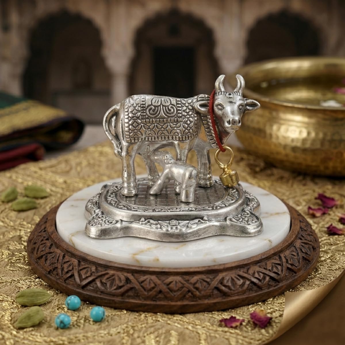 - A beautifully crafted Kamdhenu Cow with Calf idol, symbolising prosperity and devotion, perfect as a decorative showpiece for the home. Making it a neat and elegant addition to any puja space or shelf.