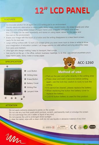 - Vibrant Display: This 12 Inch LCD writing tablet features a vibrant, colorful display for an engaging drawing and writing experience.