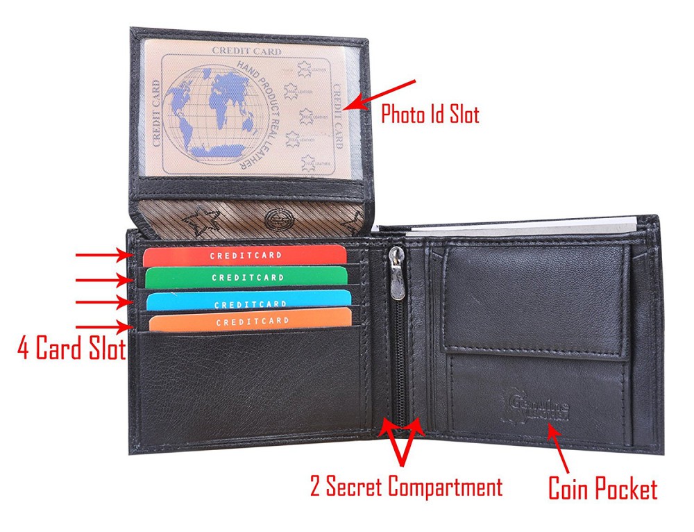 - MECHANISM: There are 4 in build Credit card slots, one Transparent Identity window for Driving License or Office I.D card, two secret compartment, and 2 Currency compartment carrying all your needs with extra comfort while carrying.