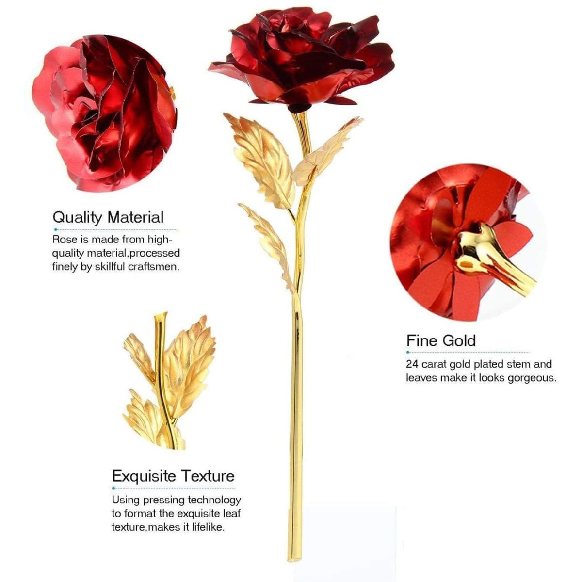 - Rose: Celebrate love with a stunning gold rose or a beautifully crafted gold plated rose. The golden red rose is a versatile option. This artificial golden red rose flower features delicate petals and stem with gold plating that looks just like a real rose. Size: Approx Height 25.5 cm /10 inch.