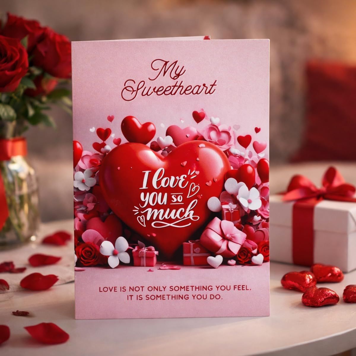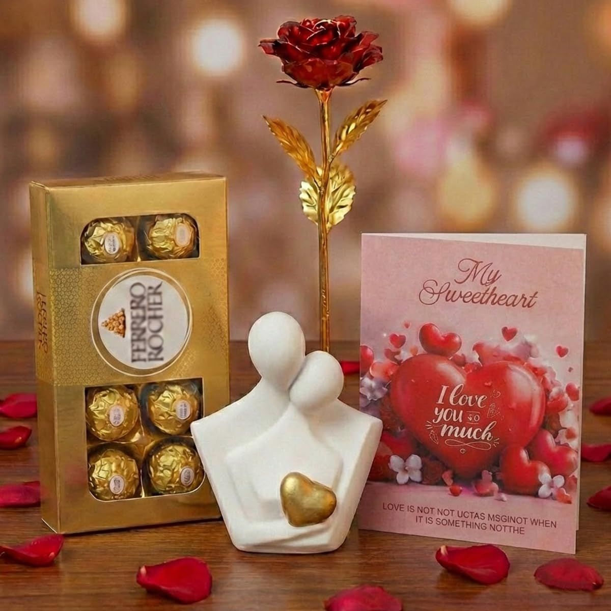 - Sales Package: 1 Romantic Couple Showpiece, 1 Love Message Greeting Card, 1 Golden Red Rose Flower, 1 Chocolate Box (Pack of 8 Pieces, 100 gm).