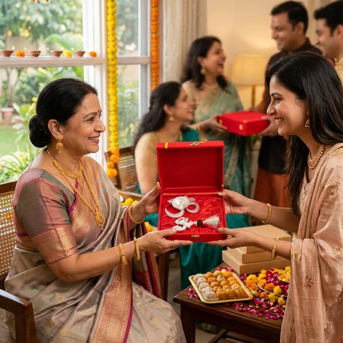 - Gifting Utility: Bell and OM diya set for pooja return gifts, wedding return gifts or shaadi return gift, marriage favors, housewarming puja gifts, engagement return gifts, varalakshmi vratham return gifts, satyanarayan pooja, varalaxmi pooja return gifts, housewarming ceremonies, baby shower return gifts, sunderkand path, ramayan path, bhagwat katha, pongal return gifts, karwachauth return gifts, makar sankranti, half saree function, dhoti ceremony, annaprashan, haldi mehendi return gifts, new year, ganesh chaturthi, dhanteras gift, diwali bulk gift items, diwali bulk gifts, corporate gifts, festivals, and other auspicious occasions.