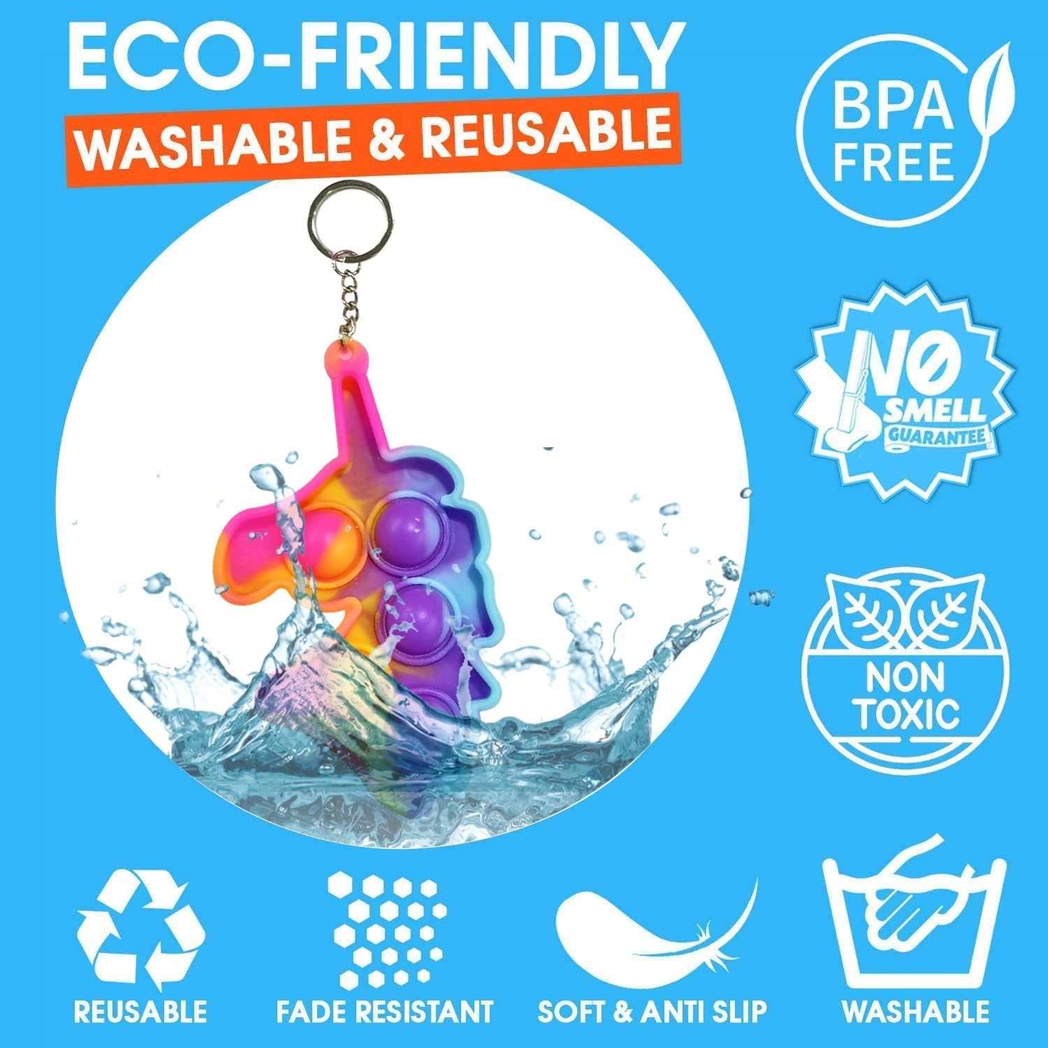 Description | The packet contains assorted design unicorn theme pop it up toys for boys or girls. Please refer to the sizes in the images. These fidget poppers create a satisfying popping sound that soothes your ears, while the soft silicone texture of each pop it up has a pampering effect on your fingertips, pop it toy helps in relaxing your mind body, poppets eliminate stress, anxiety which can be best birthday return gift for kids. |