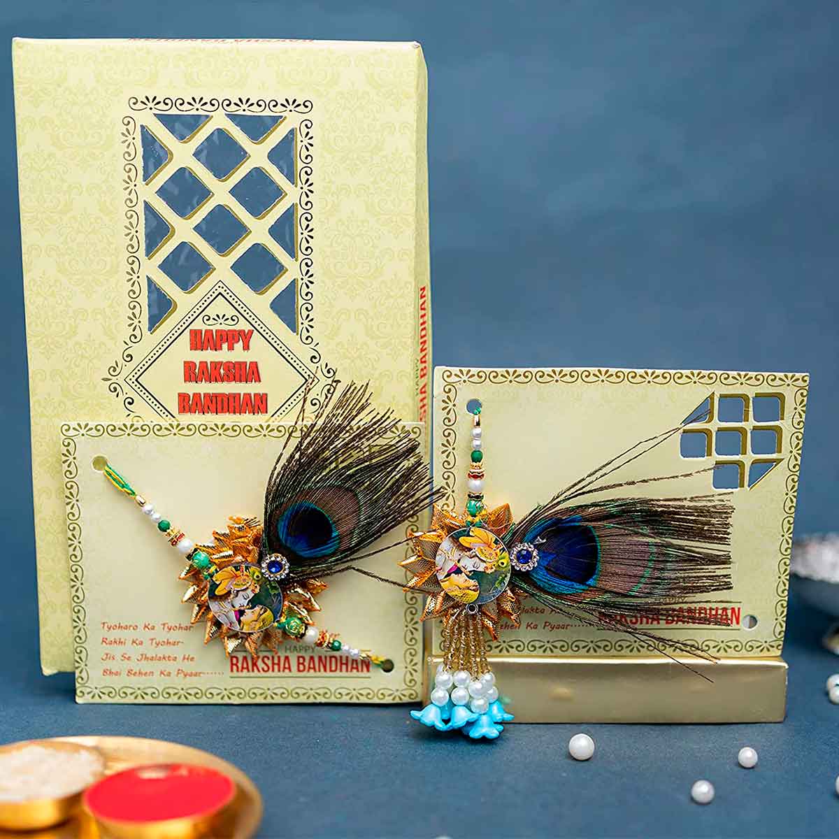 - Sale Package: 1 Radha Krishna Rakhi for Brother, 1 Radha Krishna Lumba Rakhi for Bhabhi, 1 Roli Chawal Pack.