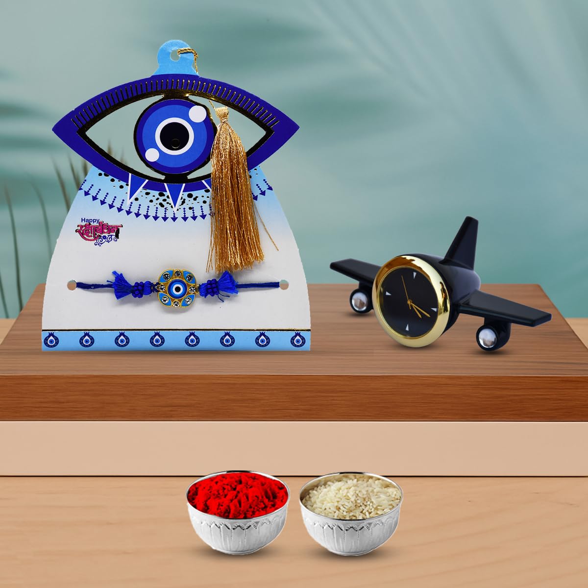 Evil Eye Rakhi For Brother with Gift Airplane Table Clock Showpiece