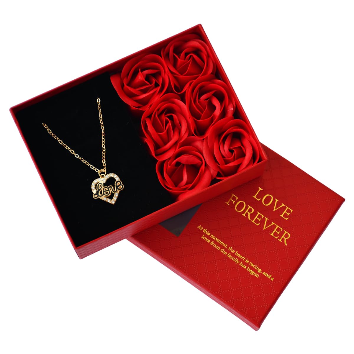 - Sales Package: 1 Love Greeting Card, 1 Love Gift Box (Love Locket, 6 Scented Red Rose Flowers) with Carry Bag, 1 Kissing Love Couple Showpiece Miniature.