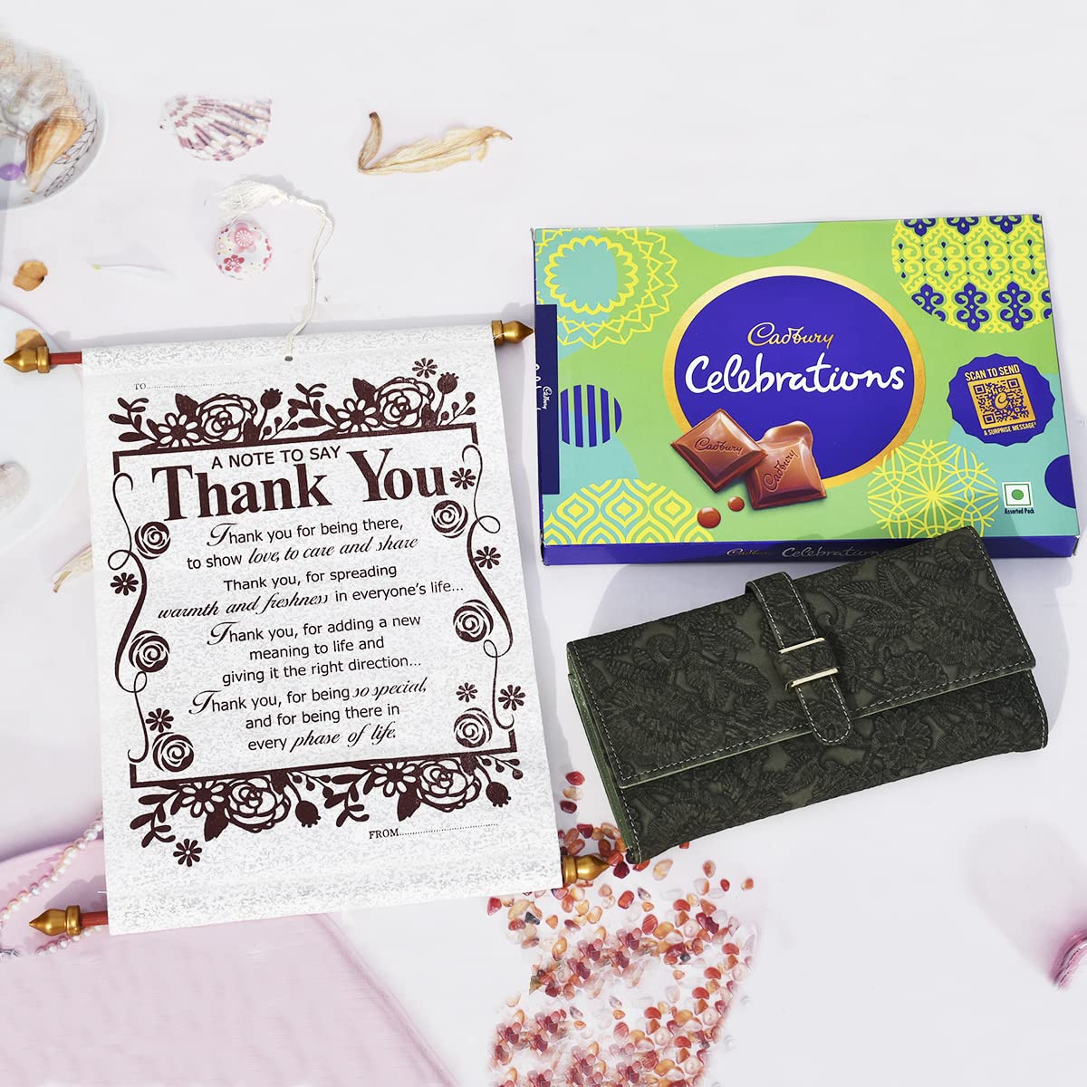 Thank You Gift for Women - Thank You Scroll Card, Hand Clutch, Chocolate Celebration Pack