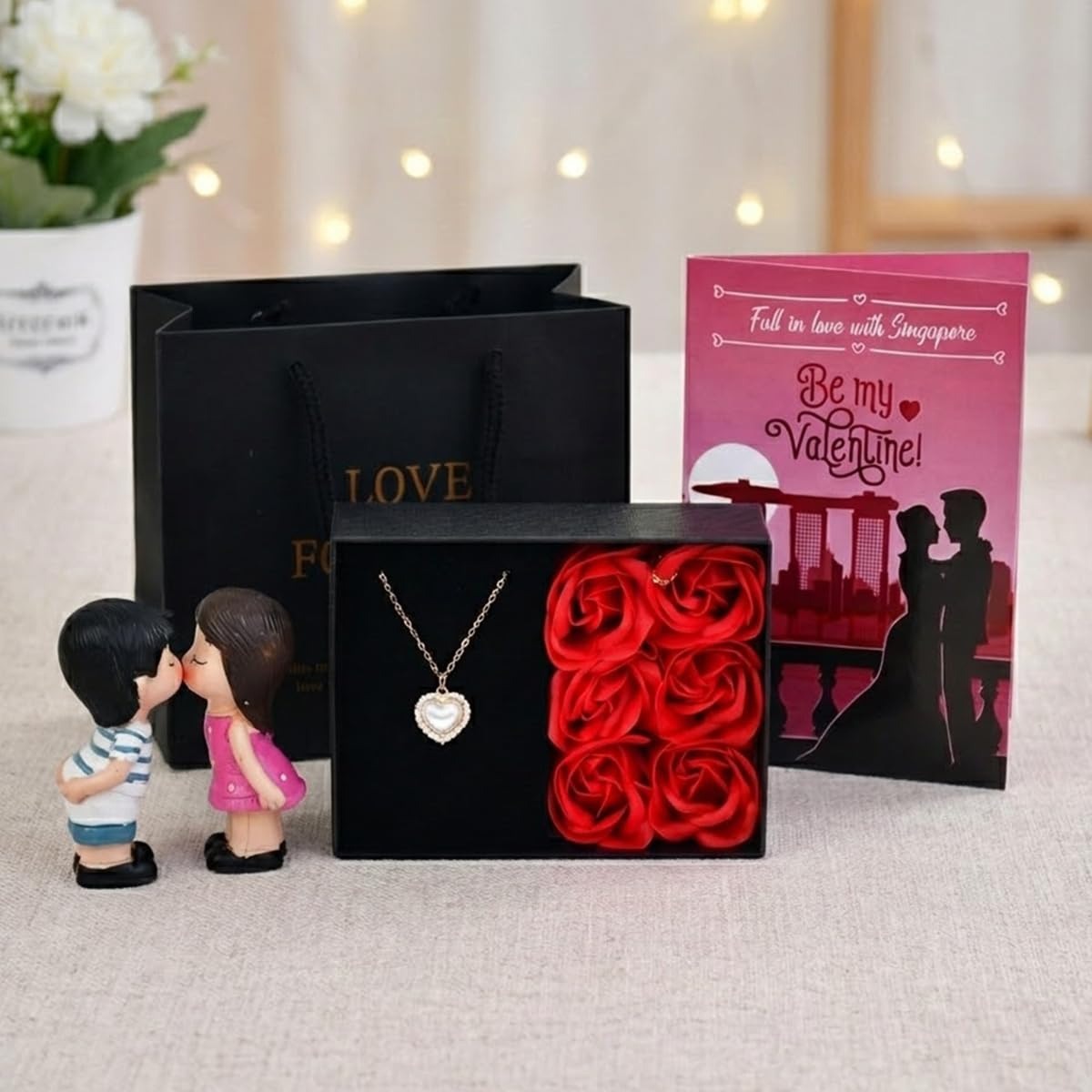 - Sales Package: 1 Love Greeting Card, 1 Love Gift Box (Love Locket / Pendant, 6 Scented Red Rose Flowers) with Carry Bag, 1 Kissing Couple Showpiece Miniature.