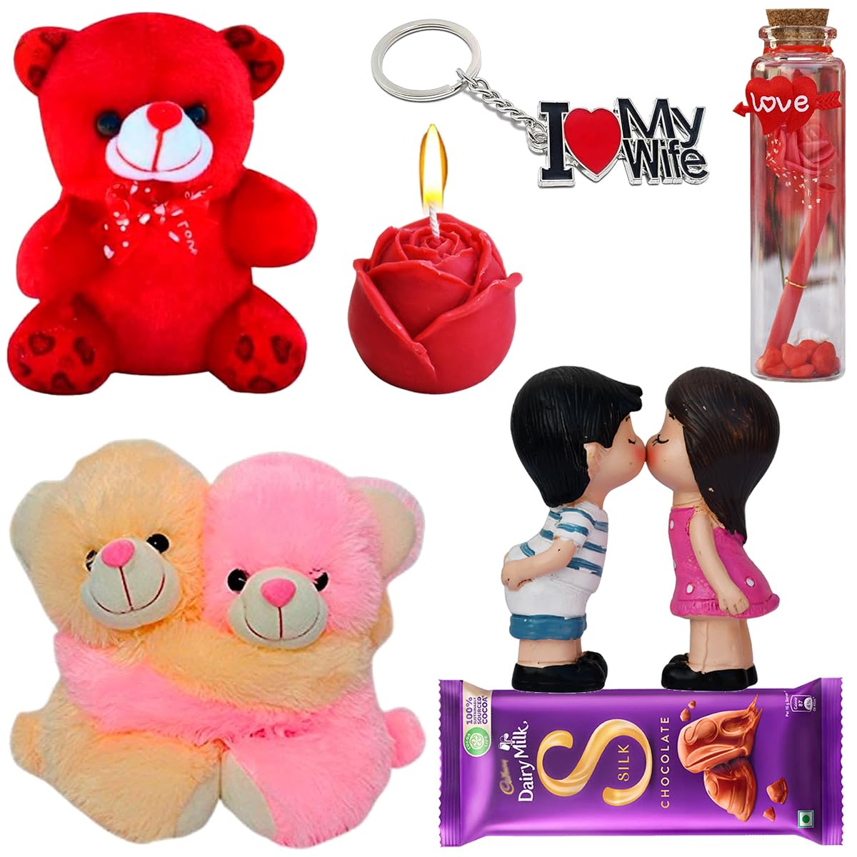 - Package Contents: 1 Scented Soy Wax Rose Candle, 1 I Love My Wife Keychain, 1 Chocolate Pack, 1 Love Teddy Bear, 1 Glass Jar Message Bottle, 1 Hugging Teddy Bear Soft Toy, 1 Kissing Couple Showpiece.